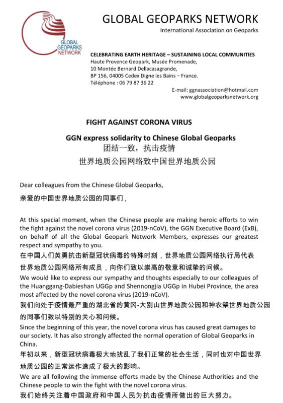 ? ? 親愛(ài)的中國(guó)地質(zhì)公園同行們,你們的困難也是我們的困難,世界地質(zhì)公園網(wǎng)絡(luò)大家庭將會(huì)始終與你們并肩作戰(zhàn)。